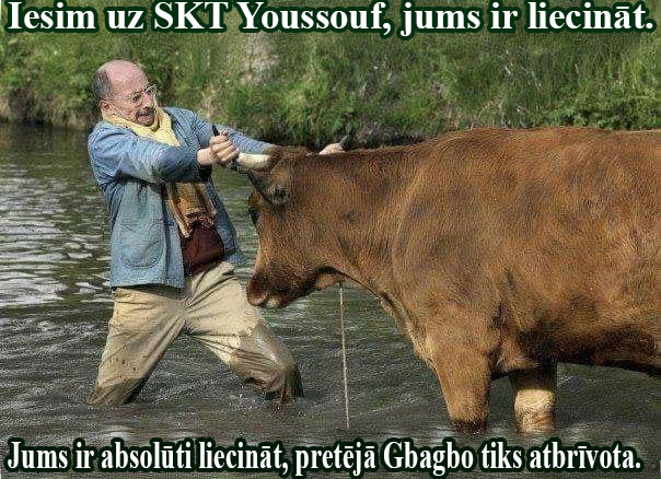 Youssouf: Jā, es par to biju dzirdējis. Es pat uzzināju par gadījumu ar tiem cilvēkiem, kurus, domājams, Abobo nogalināja Prezidents Gbagbo, bet kuri nonāca tiesā, liecinot. Kad tu man saki, ka esi izdarījis visu, es tevi saprotu. Tiešām žēl! Es tikai ceru, ka jūsu meistari neprasīs jums atmaksāt 2 miljonus dolāru, ko es uzzināju, ka viņi jums iedeva.