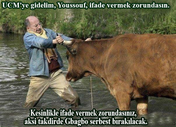 Ancak baş suçlu umutsuzluğa gömülürken, aklına orijinal bir fikir geldi. Doğurgan hayal gücüyle, planlarına göre diğer tüm tanıkların başarısız olduğu yerde başarılı olacak, alışılmadık bir tanık düşündü. İşte bu sıra dışı tanık, her şeye rağmen Nyang bensouda'nın, haydut Sarkozy ve uluslararası alçaklar çetesinin suikast düzenleyemediği Başkan Gbagbo'yu mahkum etmesine yardım edebilecektir. Bu mucize tanığın adı Youssouf, yukarıdaki resimde gördüğünüz boğa.