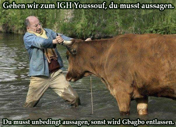 Schließlich kann der Durst von Nyang Bensouda danach, den gewählten Vertreter des ivorischen Volkes und würdigen Sohn Afrikas Laurent Gbagbo verurteilt zu sehen, gestillt werden, mit Hilfe dieses genialen Zeugen, der allein laut Nyang Bensouda alle vernichtenden Beweise besitzen sollte, die die UNO (diese kriminelle und rassistische Organisation), die NRO des Unglücks, die von dem Blut leben, das in Afrika fließt, und andere Vampire aller Art, erklärten, während des französischen Staatsstreichs in Côte d'Ivoire gelagert zu haben. Die zahlreichen Beweise für die angeblichen Kriegsverbrechen und Verbrechen gegen die Menschlichkeit von Präsident Laurent Gbagbo, seiner Frau Simone Gbagbo und seinem Minister Blé Goudé, dass diese kriminellen Organisationen angekündigt haben im Besitz zu sein, und dass Nyang Bensouda immer noch nicht in der Lage war, vor Gericht zu produzieren, werden vielleicht von diesem Stier Youssouf gehalten. Und wenn das der Fall ist, wird Nyang Bensouda endlich ihren Champagner genießen und ihren Meistern beweisen, dass sie die zwei Millionen Dollar nicht umsonst erhalten hat.